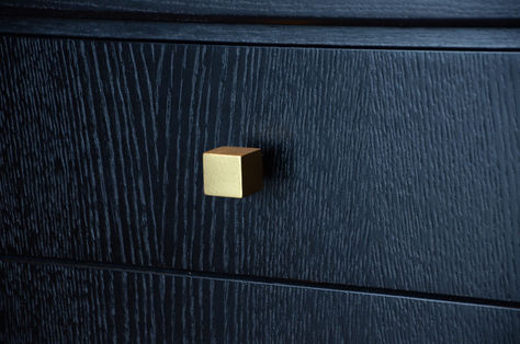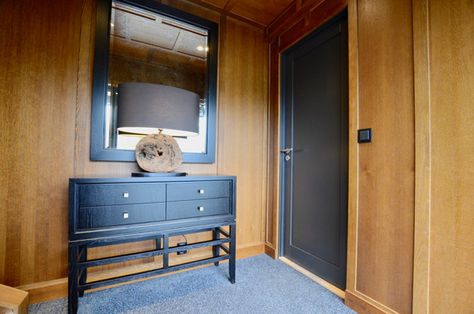 Dette inngangspartiet er måltilpasset med et sort konsollbord i eikefinér designet av Gustavian AS. Et bronsjespeil med sort ramme henger over bordet, og vegger og tak i antikk eik skaper en varm atmosfære. Firkantede knotter i antikk gull fra R. Bergersen kompletterer helheten.