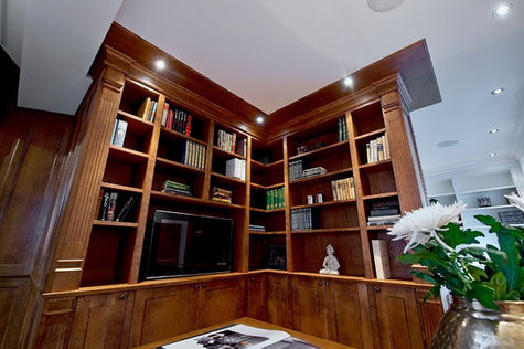 Et håndlaget bibliotek i antikk eik beis + lakk, med utsmykkede pilastere, brystningspanel og hyllebærere med løvehoder. Bokhyller med både åpne og lukkede felt, innebygget skrivebord og nedsenkbar TV. Detaljene fullføres av knotter i antikk messing oval og alternative løsninger med glasskap og lange håndtak i blank messing.
