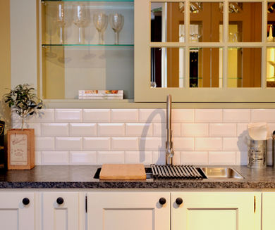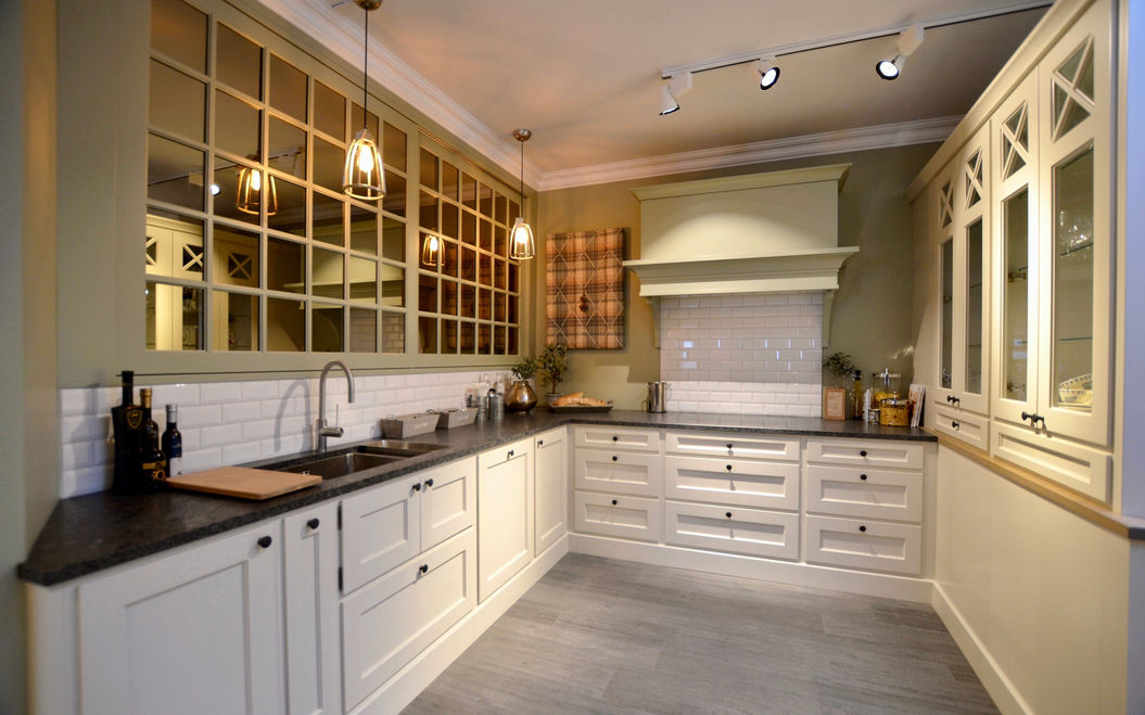 Dette spennende kjøkkenet kombinerer to fargetoner – en rolig beige og en frodig grønn – for et levende uttrykk. Plassbygde skyvedører med bronsjespeil skaper fleksible soner, mens en fritthengende spesialdesignet kjøkkenhette gir et skulpturelt element. Sort lærbehandlet granitt og en Reginox-vask gir et solid fundament, og antikke tinn-knotter tilfører en klassisk vri. Kjøkkenet er skreddersydd for å balanse estetikk og funksjon.